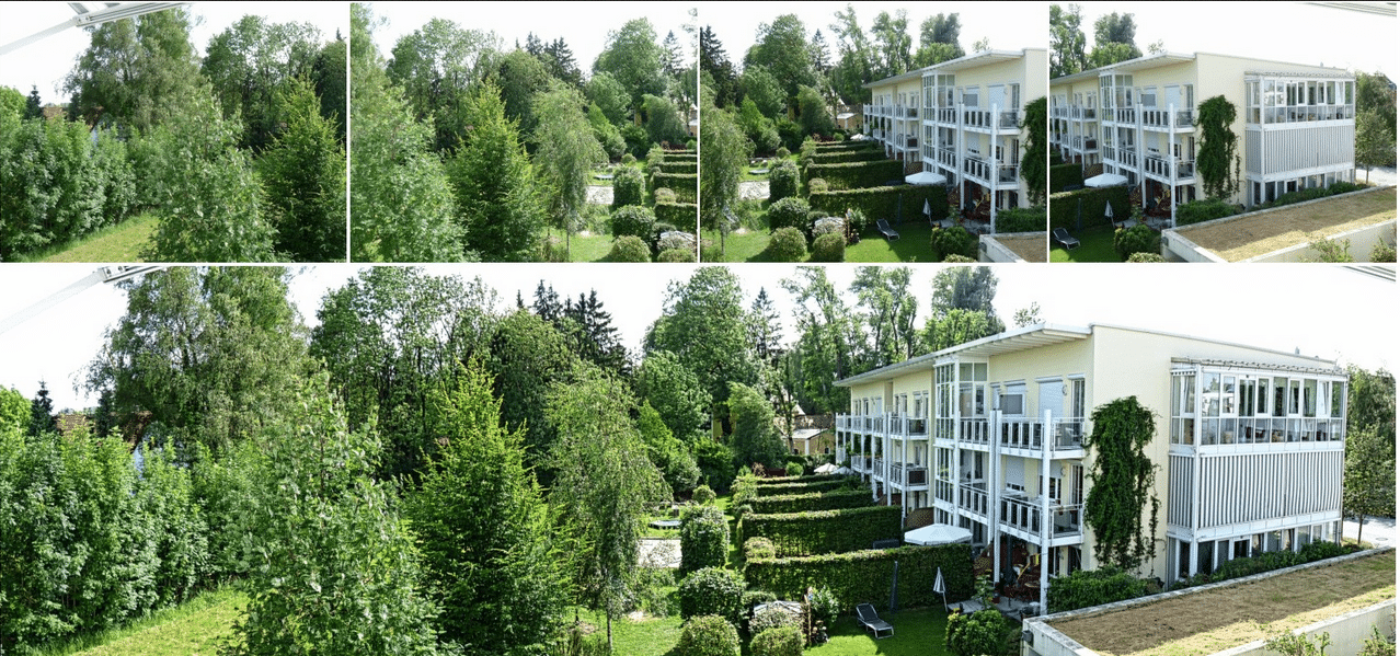 Otra diferencia es que, a veces, un simple recorte no cubre la escena que se desea, ya sea porque no puede ir lo suficientemente lejos o porque no tiene una lente angular que lo permita. En este caso, la única solución es el método de secuenciación de múltiples imágenes.